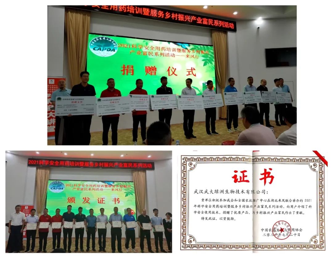 武漢武大綠洲生物技術(shù)有限公司作為中國(guó)農(nóng)藥發(fā)展與應(yīng)用協(xié)會(huì)常務(wù)理事單位,積極參與了本次公益活動(dòng),為來(lái)鳳縣的種植戶捐贈(zèng)價(jià)值三萬(wàn)元優(yōu)質(zhì)生物農(nóng)藥,受到各級(jí)領(lǐng)導(dǎo)和種植戶的贊譽(yù)。中國(guó)農(nóng)藥發(fā)展與應(yīng)用協(xié)會(huì)為武大綠洲頒發(fā)捐贈(zèng)證書(shū)和捐贈(zèng)支票,以表達(dá)對(duì)公司參與公益活動(dòng)、為鄉(xiāng)村振興產(chǎn)業(yè)富民做出積極貢獻(xiàn)的肯定。