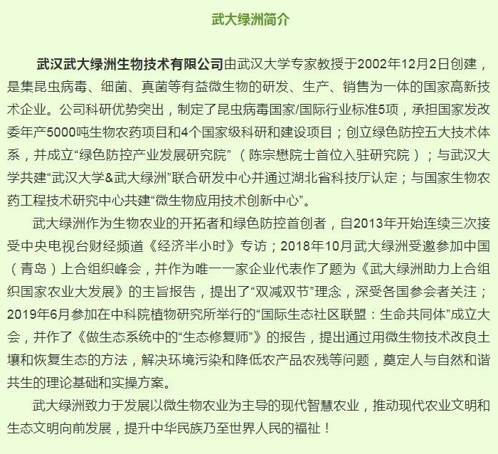 Copyright © 2013 武漢武大綠洲生物科技集團(tuán)有限公司 版權(quán)所有 鄂ICP備05003723號-1 公安備案號:42018502001619 生物農(nóng)藥,綠色防控,病蟲害防治,殺蟲劑,殺菌劑,水稻農(nóng)藥,茶葉農(nóng)藥,有機(jī)蔬菜農(nóng)藥,環(huán)保農(nóng)藥公司,昆蟲病毒生物農(nóng)藥廠家 辦公
