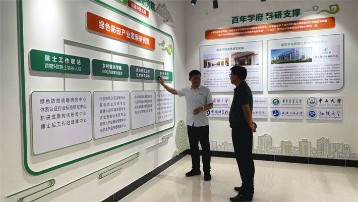 林春鴻董事長帶領(lǐng)大家參觀了公司展廳,為大家詳細(xì)介紹了武大綠洲公司優(yōu)勢技術(shù)、產(chǎn)品以及綠色防控技術(shù)理念。阮教授和曾教授對武大綠洲以微生物技術(shù)為核心的綠色防控體系、一切為了人民健康的經(jīng)營理念表示十分認(rèn)可,今后將在綠色防控技術(shù)領(lǐng)域開展深入合作。
