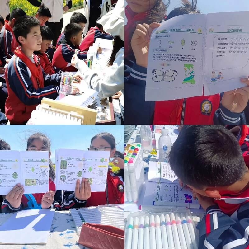 知識講解結(jié)束后,學(xué)生們充分發(fā)揮各自的想象力,在手冊上用五彩斑斕的畫筆為蚜蟲、菜青蟲以及菜粉蝶精心涂色,創(chuàng)作的作品各具特色,有人將蚜蟲畫成“彩虹戰(zhàn)士”,有人為菜粉蝶添上科幻翅膀,童趣創(chuàng)意讓科技與藝術(shù)交融,展現(xiàn)出他們對所學(xué)昆蟲的獨(dú)特理解。最后,全體學(xué)生深入田間,近距離觀賞大片盛開的油菜花,尋找幼嫩菜莢、對比健康與病害植株,親身感受大自然與農(nóng)業(yè)知識融合的魅力。