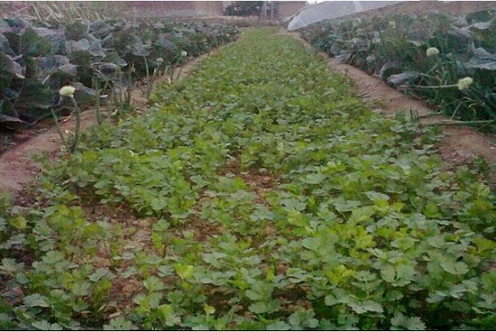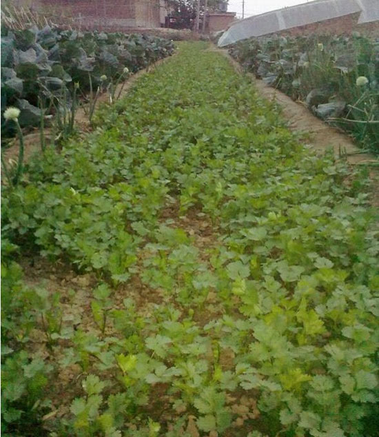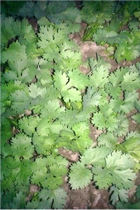 香菜比較稀疏,濃密不均,葉面青嫩,植株矮小枯萎。