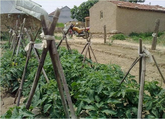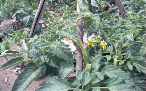 搭架栽培西紅柿植株健壯,開(kāi)起了小黃花,葉色濃綠,攀枝莖干筆直加粗,提前早熟起來(lái)