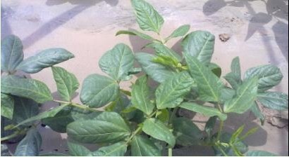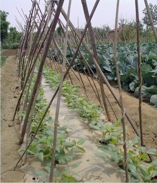 豆角幼株在地膜上剛剛出苗,葉片淡綠,植株莖干細(xì)小,彎曲不一,葉面矮小,有雞爪葉,枯焉現(xiàn)象,生長(zhǎng)比較緩慢。