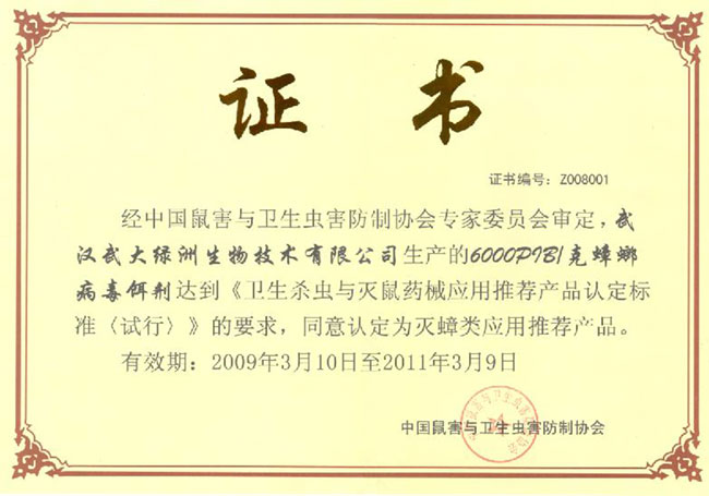 2009滅蟑類應(yīng)用推薦產(chǎn)品證書
