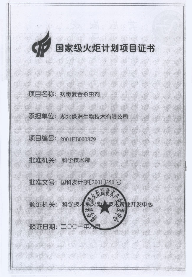 2001國家級火炬計(jì)劃項(xiàng)目證書