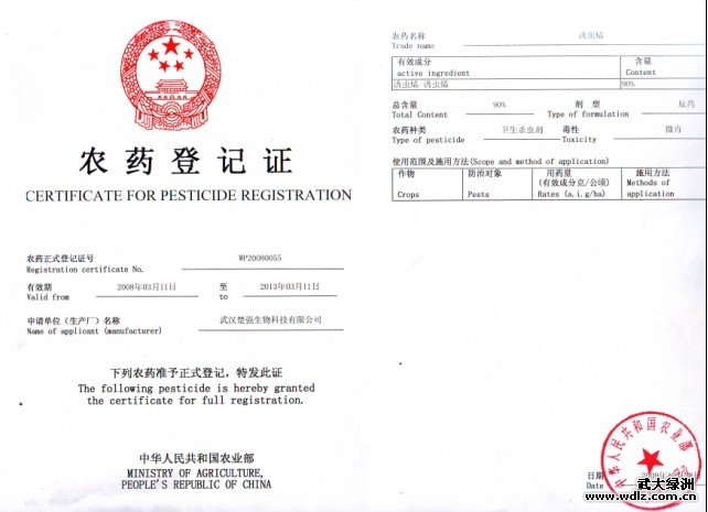 據(jù)悉,武大綠洲此次獲得的原藥正式登記證有:蟑螂病毒原藥、誘蟲烯原藥、菜青蟲顆粒體病毒原藥、甜菜夜蛾核型多角體病毒原藥、茶尺蠖核型多角體病毒原藥、松毛蟲質(zhì)型多角體病毒原藥。