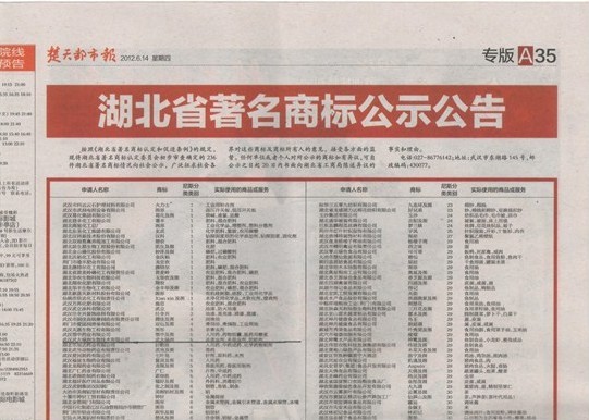按照《湖北省著名商標(biāo)認(rèn)定和促進(jìn)條例》的規(guī)定,現(xiàn)將湖北省著名商標(biāo)認(rèn)定委員會(huì)初步審查確定的236件湖北省著名商標(biāo)情況向社會(huì)公示,廣泛征求社會(huì)各界對(duì)這些商標(biāo)及商標(biāo)所有人的意見(jiàn),接受各方面的監(jiān)督。任何單位或者...